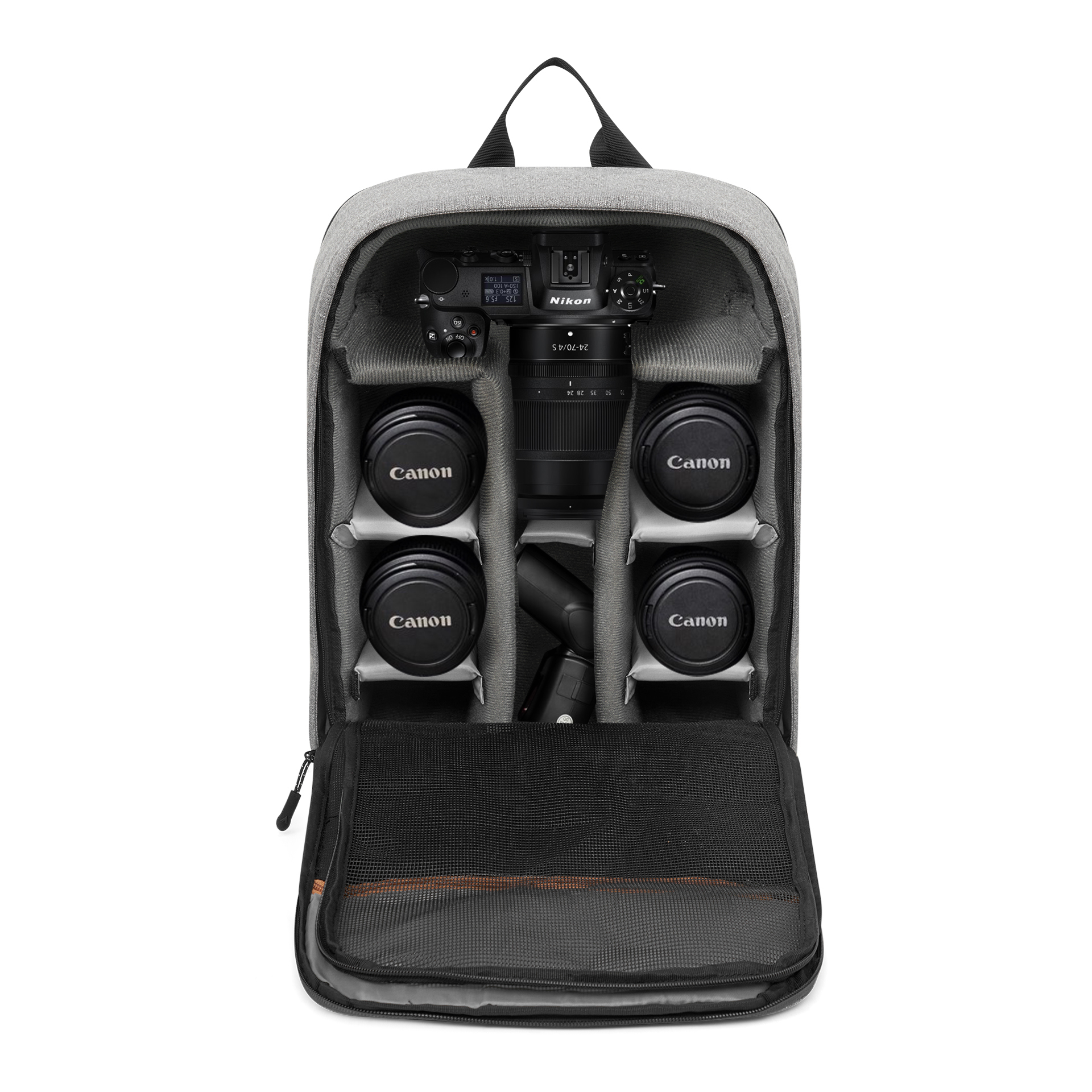Cấu tạo ba lô gồm 2 ngăn chính nằm song song với nhau, 1 ngăn chuyên dụng được dùng để đựng Body và bộ Lens Tele. Ngăn bên cạnh được chia thành từng kệ nhỏ cho phép bạn đựng ống kính, pin sạc và những phụ kiện cần thiết cho chiếc máy ảnh. Ba lô còn có ngăn đựng áo mưa và tránh bụi. Là ba lô loại hai quai, ngăn chứa thiết bị rộng, chất liệu vải chống thấm nhẹ, hạn chế việc thiết bị tiếp xúc với độ ẩm của môi trường.